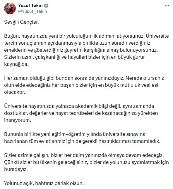 Milli Eğitim Bakanı Yusuf Tekin, 2025-YKS sonuçlarına ilişkin sosyal medya hesabından yaptığı açıklamada, "Sevgili gençler; bugün, hayatınızda yeni bir yolculuğun ilk adımını atıyorsunuz. Üniversite tercih sonuçlarının açıklanmasıyla birlikte uzun süredir verdiğiniz emeklerin ve gösterdiğiniz gayretin karşılığını almış bulunuyorsunuz. Sizlerin azmi, çalışkanlığı ve hayalleri bizler için en büyük gurur kaynağıdır. Her zaman olduğu gibi bundan sonra da yanınızdayız. Nerede olursanız olun elde edeceğiniz her başarı bizler için en büyük mutluluk vesilesi olacaktır. Üniversite hayatınızda yalnızca akademik bilgi değil, aynı zamanda dostluklar, değerler ve hayat tecrübeleri de kazanacağınıza yürekten inanıyorum. Bununla birlikte yeni eğitim öğretim yılında üniversite sınavına hazırlanan tüm evlatlarımız için de gerekli hazırlıklarımızı tamamladık. Sizler azimle çalışın; bizler her daim yanınızda olmaya devam edeceğiz. Çünkü sizler bu ülkenin geleceğisiniz, bizler de yolunuzu aydınlatmak için buradayız. Yolunuz açık, bahtınız parlak olsun" dedi.