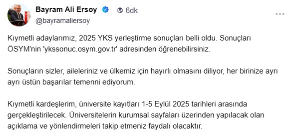 ÖSYM Başkanı Prof. Dr. Bayram Ali Ersoy, konuya ilişkin NSosyal hesabından yaptığı açıklamada, “Kıymetli adaylarımız, 2025 YKS yerleştirme sonuçları belli oldu. Sonuçları ÖSYM'nin 'ykssonuc.osym.gov.tr' adresinden öğrenebilirsiniz. Sonuçların sizler, aileleriniz ve ülkemiz için hayırlı olmasını diliyor, her birinize ayrı ayrı üstün başarılar temenni ediyorum. Kıymetli kardeşlerim, üniversite kayıtları 1-5 Eylül 2025 tarihleri arasında gerçekleştirilecek. Üniversitelerin kurumsal sayfaları üzerinden yapılacak olan açıklama ve yönlendirmeleri takip etmeniz faydalı olacaktır" dedi.