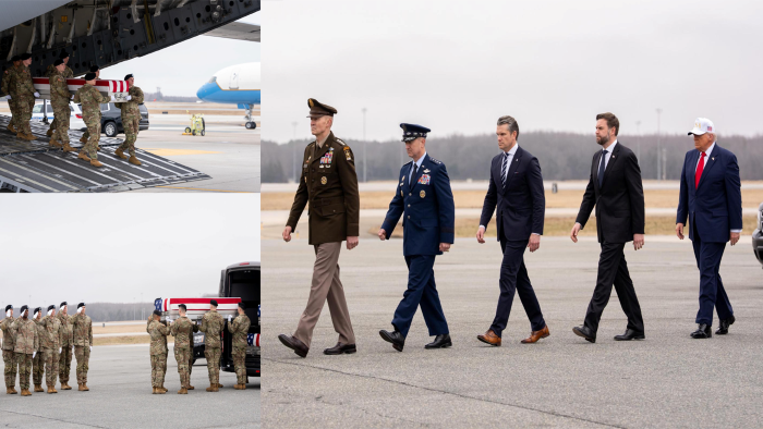 Burada düzenlenen törene ABD Başkanı Donald Trump ve eşi Melania Trump, ABD Başkan Yardımcısı JD Vance ve eşi Usha Vance, ABD Savunma Bakanı Pete Hegseth, Trump'ın Orta Doğu Özel Temsilcisi Steve Witkoff ile üst düzey asker ve hükümet yetkilileri katıldı. Trump ve diğer katılımcılar, cenazeleri asker selamı ile karşılarken, törende herhangi bir konuşma yapılmadı.
