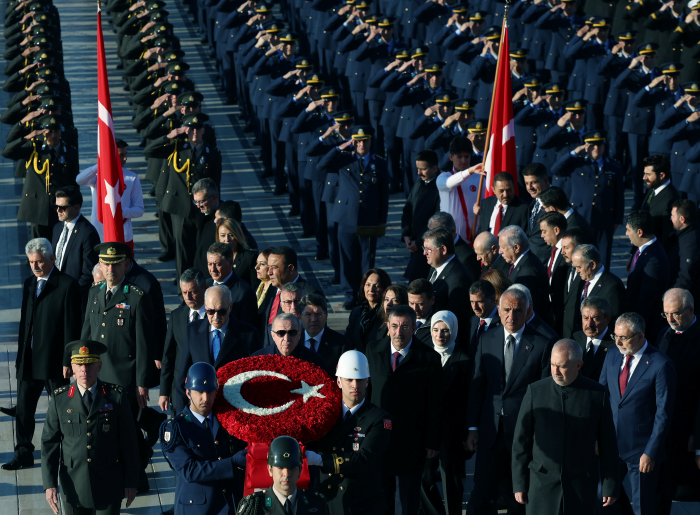 Törene; Cumhurbaşkanı Recep Tayyip Erdoğan'ın yanı sıra Türkiye Büyük Millet Meclisi Başkanı Numan Kurtulmuş, Cumhurbaşkanı Yardımcısı Cevdet Yılmaz, CHP Genel Başkanı Özgür Özel, MHP Genel Başkanı Devlet Bahçeli, İYİ Parti Genel Başkanı Müsavat Dervişoğlu, bakanlar, kuvvet komutanları, yüksek yargı üyeleri, askeri personel ve öğrenciler katıldı. Cumhurbaşkanı Erdoğan ve beraberindekiler, Aslanlı Yol'dan yürüyerek, Atatürk'ün mozolesine geldi.