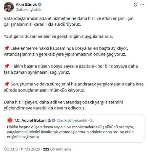 Bakan Gürlek, "Vatandaşlarımızın adalet hizmetlerine daha hızlı ve etkin erişimi için çalışmalarımızı kararlılıkla sürdürüyoruz. Yaptığımız düzenlemeler ve geliştirdiğimiz uygulamalarla; lekelenmeme hakkı kapsamında dosyaları en başta ayıklıyor, vatandaşlarımızın gereksiz yere yıpranmasının önüne geçiyoruz. Hakim başına düşen dosya sayısını azaltarak her bir dosyaya daha fazla zaman ayrılmasını sağlıyoruz. Soruşturma ve dava süreçlerini hızlandırarak yargılamaların daha kısa sürede sonuçlanmasını mümkün kılıyoruz. Daha hızlı işleyen, daha adil ve vatandaş odaklı yargı sistemini güçlendirmeye kararlılıkla devam ediyoruz" dedi.