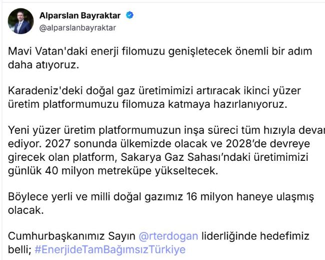 Bayraktar, NSosyal hesabından yaptığı açıklamada da "Mavi Vatan'daki enerji filomuzu genişletecek önemli bir adım daha atıyoruz. Karadeniz'deki doğal gaz üretimimizi artıracak ikinci yüzer üretim platformumuzu filomuza katmaya hazırlanıyoruz. Yeni yüzer üretim platformumuzun inşa süreci tüm hızıyla devam ediyor. 2027 sonunda ülkemizde olacak ve 2028'de devreye girecek olan platform, Sakarya Gaz Sahası'ndaki üretimimizi günlük 40 milyon metreküpe yükseltecek. Böylece yerli ve milli doğal gazımız, 16 milyon haneye ulaşmış olacak. Cumhurbaşkanımız Sayın Recep Tayyip Erdoğan liderliğinde hedefimiz belli; enerjide tam bağımsız Türkiye" ifadelerine yer verdi.
