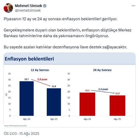 Hazine ve Maliye Bakanı Mehmet Şimşek, piyasa katılımcıları anketi verilerine ilişkin sosyal medya hesabından açıklama yaptı. Bakan Şimşek, "Piyasanın 12 ay ve 24 ay sonrası enflasyon beklentileri geriliyor. Gerçekleşmelere duyarlı olan beklentilerin, enflasyon düştükçe Merkez Bankası tahminlerine daha da yakınsamasını öngörüyoruz. Bu sayede azalan katılıklar dezenflasyona ilave destek sağlayacaktır" dedi.