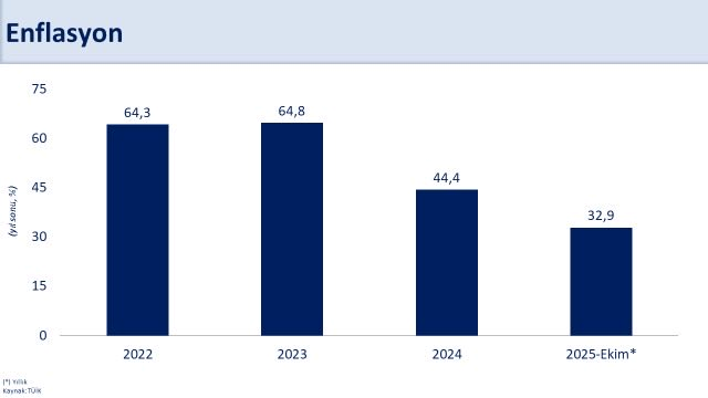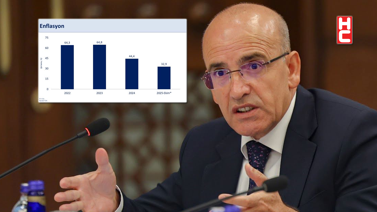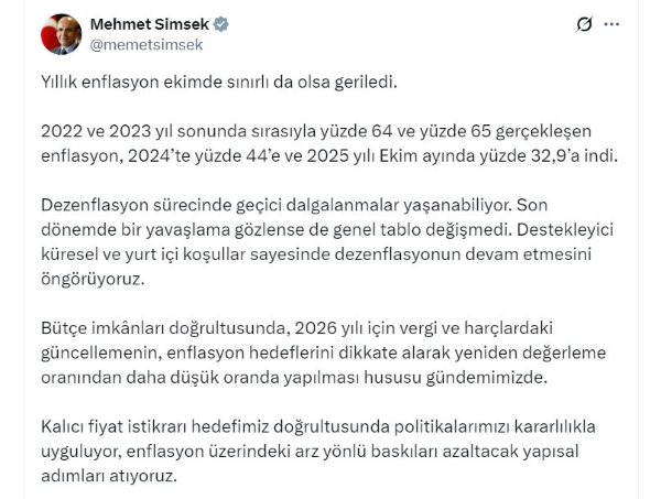 Şimşek, sosyal medya hesabından yaptığı açıklamada, "Yıllık enflasyon ekimde sınırlı da olsa geriledi. 2022 ve 2023 yıl sonunda sırasıyla yüzde 64 ve yüzde 65 gerçekleşen enflasyon, 2024'te yüzde 44'e ve 2025 yılı ekim ayında yüzde 32,9'a indi. Dezenflasyon sürecinde geçici dalgalanmalar yaşanabiliyor.
