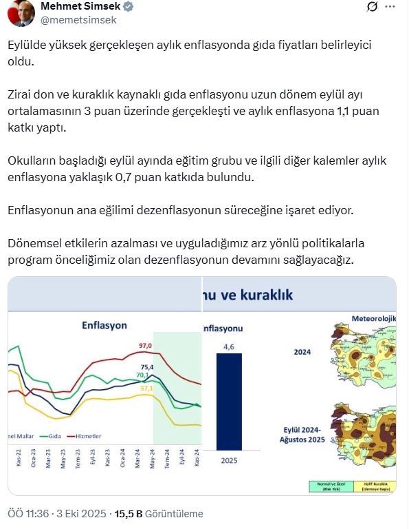 Şimşek, "Eylülde yüksek gerçekleşen aylık enflasyonda gıda fiyatları belirleyici oldu. Zirai don ve kuraklık kaynaklı gıda enflasyonu uzun dönem eylül ayı ortalamasının 3 puan üzerinde gerçekleşti ve aylık enflasyona 1,1 puan katkı yaptı. Okulların başladığı eylül ayında eğitim grubu ve ilgili diğer kalemler aylık enflasyona yaklaşık 0,7 puan katkıda bulundu.