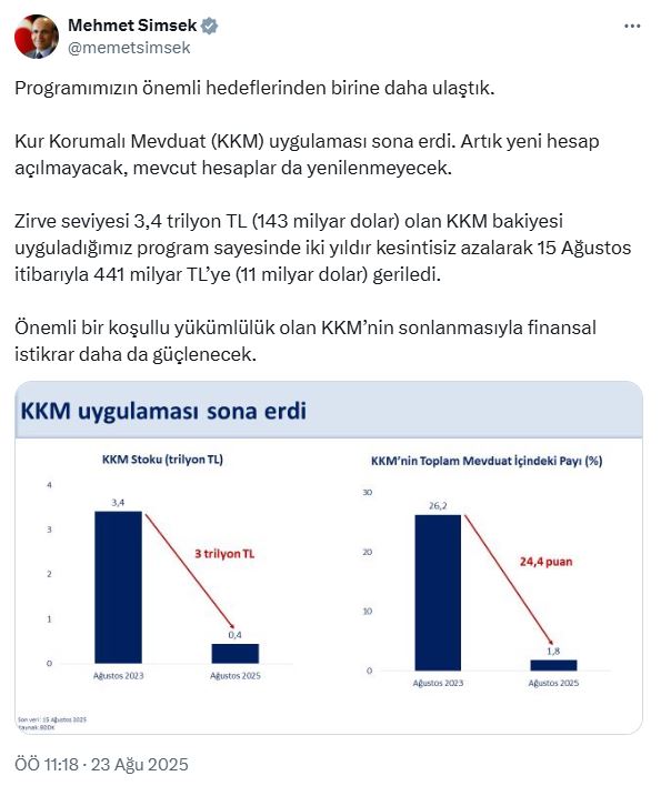 Hazine ve Maliye Bakanı Mehmet Şimşek, sosyal medya hesabından yaptığı açıklamada, "Programımızın önemli hedeflerinden birine daha ulaştık. Kur Korumalı Mevduat uygulaması sona erdi. Artık yeni hesap açılmayacak, mevcut hesaplar da yenilenmeyecek. Zirve seviyesi 3,4 trilyon TL (143 milyar dolar) olan KKM bakiyesi uyguladığımız program sayesinde iki yıldır kesintisiz azalarak 15 Ağustos itibarıyla 441 milyar TL'ye (11 milyar dolar) geriledi. Önemli bir koşullu yükümlülük olan KKM'nin sonlanmasıyla finansal istikrar daha da güçlenecek" dedi.
