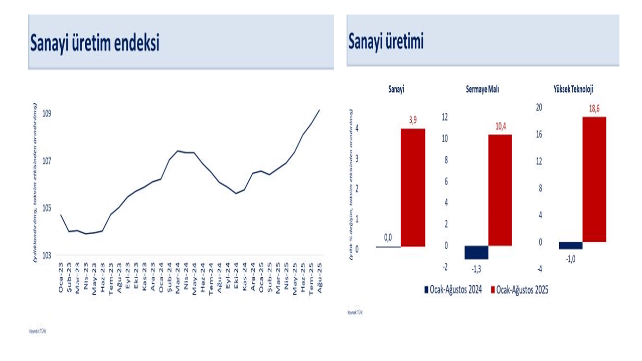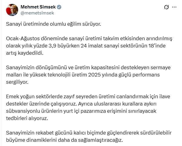 Hazine ve Maliye Bakanı Mehmet Şimşek, "Sanayi üretiminde olumlu eğilim sürüyor. Ocak-ağustos döneminde sanayi üretimi takvim etkisinden arındırılmış olarak yıllık yüzde 3,9 büyürken, 24 imalat sanayi sektörünün 18’inde artış kaydedildi" dedi.