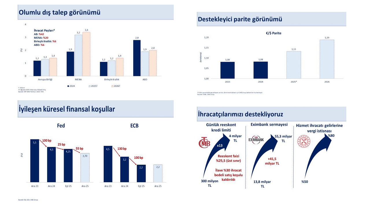 İthalattaki artışa rağmen, mal ve hizmet ihracatındaki olumlu performans sayesinde cari denge sürdürülebilir seviyelerde kalmaya devam ediyor. Katma değerli üretim ve rekabet gücünü artıran politikalarımızla üreticilerimizi ve ihracatçılarımızı desteklemeyi sürdüreceğiz" ifadelerine yer verdi.