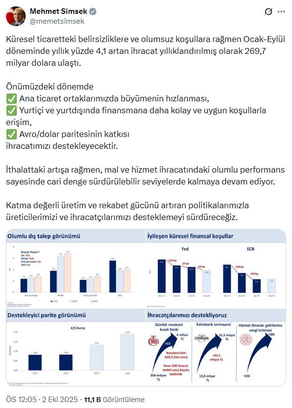 Bakan Şimşek, "Küresel ticaretteki belirsizliklere ve olumsuz koşullara rağmen ocak-eylül döneminde yıllık yüzde 4,1 artan ihracat yıllıklandırılmış olarak 269,7 milyar dolara ulaştı. Önümüzdeki dönemde ana ticaret ortaklarımızda büyümenin hızlanması, yurt içi ve yurt dışında finansmana daha kolay ve uygun koşullarla erişim, avro/dolar paritesinin katkısı ihracatımızı destekleyecektir.