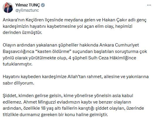 Adalet Bakanı Yılmaz Tunç, sosyal medya hesabından yaptığı açıklamada, Ankara’nın Keçiören ilçesinde Hakan Çakır'ın öldürülmesinin herkesi derinden üzdüğünü belirterek, "Olayın ardından yakalanan şüpheliler hakkında Ankara Cumhuriyet Başsavcılığınca 'Kasten öldürme' suçundan başlatılan soruşturma çok yönlü olarak yürütülmekte olup, 4 şüpheli Sulh Ceza Hakimliğince tutuklanmıştır. Hayatını kaybeden kardeşimize Allah’tan rahmet, ailesine ve yakınlarına sabır diliyorum. Şiddet, kimden gelirse gelsin, kime yönelirse yönelsin asla kabul edilemez. Ahmet Minguzzi evladımızın kaybı ve benzer olayların ardından, özellikle 18 yaş altı faillerin karıştığı şiddet olayları, üzerinde titizlikle durmamız gereken bir konu haline gelmiştir. Bu çerçevede çocukların suça sürüklenmesini engellemek ve toplumumuzun huzurunu korumak amacıyla soruşturma, kovuşturma ve infaz aşaması ile ilgili olarak Türk Ceza Kanunumuzda ve bazı kanunlarda yeni düzenleme ihtiyacı doğmuştur" ifadelerini kullandı.