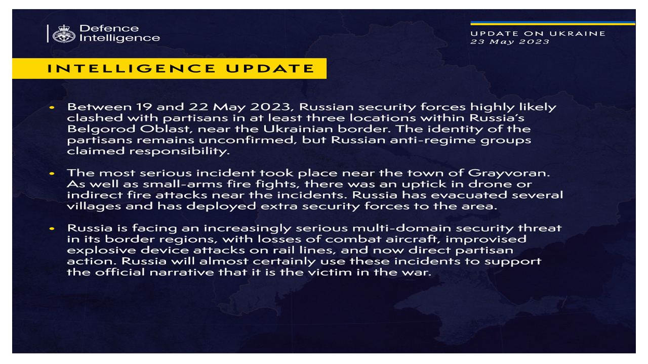 Öte yandan İngiltere Savunma Bakanlığı tarafından Rusya-Ukrayna savaşına dair yayımlanan günlük istihbarat raporunda, 19-22 Mayıs arasında Rus güvenlik güçlerinin büyük olasılıkla Rusya’nın Ukrayna sınırına yakın Belgorod bölgesinde en az 3 noktada partizanlarla çatıştığı belirtilerek, “Partizanların kimliği henüz doğrulanmadı, ancak Rus rejim karşıtı gruplar sorumluluğu üstlendi. En ciddi olay Grayvoran kasabası yakınlarında meydana geldi. Hafif silahlı çatışmaların yanı sıra, olayların yakınında drone veya dolaylı saldırılarda artış oldu. Rusya birkaç köyü boşalttı ve bölgeye ek güvenlik güçleri konuşlandırdı” denildi.