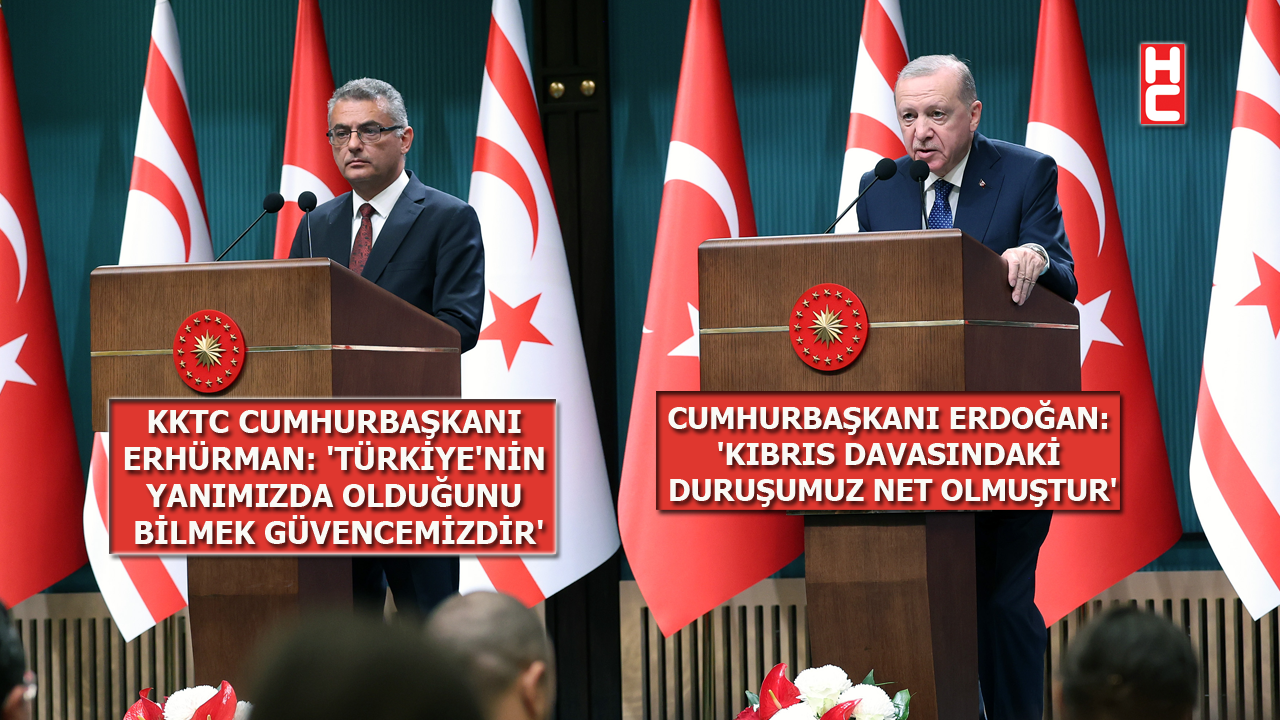 Cumhurbaşkanı Recep Tayyip Erdoğan, KKTC Cumhurbaşkanı Tufan Erhürman ile Cumhurbaşkanlığı Külliyesi'nde ortak basın toplantısı düzenledi. KKTC Cumhurbaşkanı Erhürman'ı tebrik ederek sözlerine başlayan Erdoğan, 2 gün sonra KKTC'nin kuruluş yıl dönümü olduğunu hatırlatarak, "2 gün sonra 42'nci kuruluş yıl dönümünü idrak edeceğimiz KKTC'nin bu müstesna gününü tebrik ediyor, Kıbrıs Türk'ü kardeşlerime muhabbetlerimi gönderiyorum. Milli davamız Kıbrıs'ta adil, kalıcı ve Ada'daki gerçeklere uygun bir çözüme ulaşılmasına yönelik mücadelemizi Sayın Erhürman'la yakın eş güdüm içerisinde kararlılıkla sürdüreceğiz" dedi.