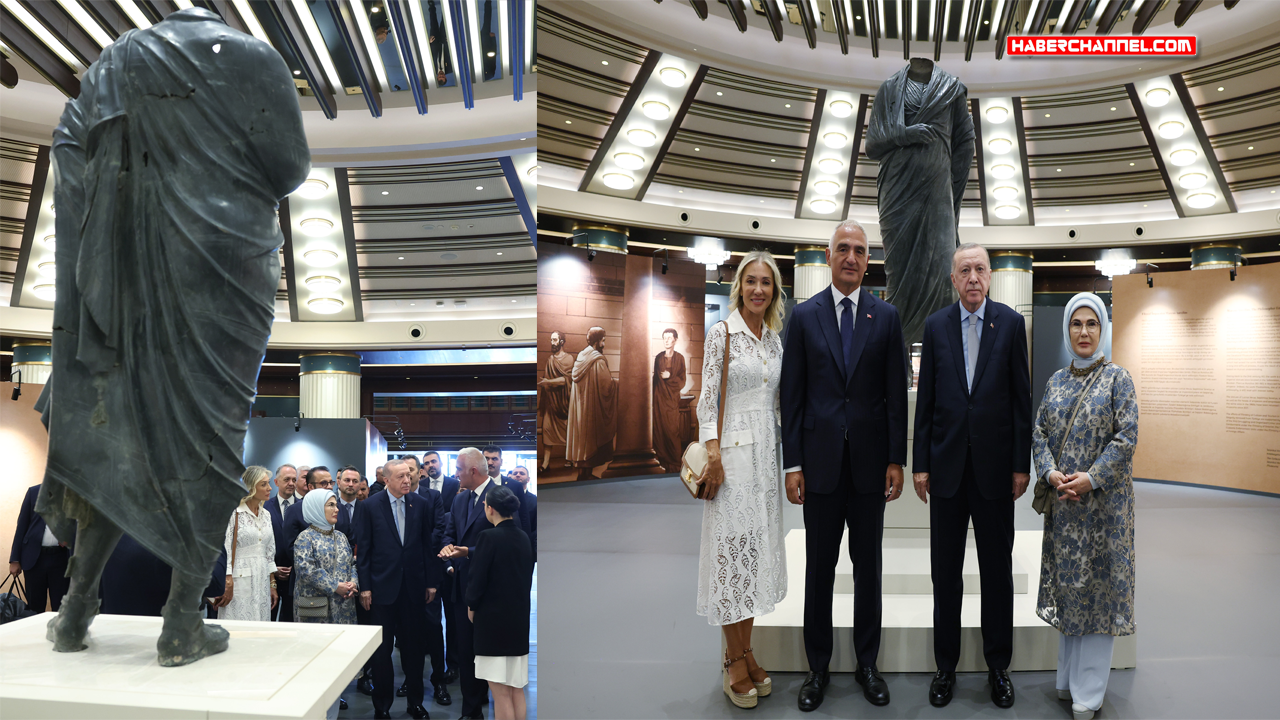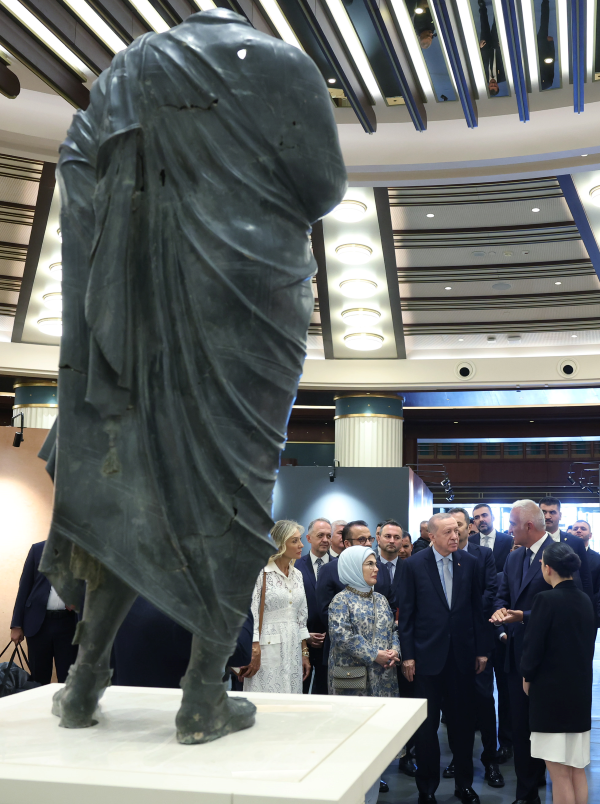 Cumhurbaşkanı Erdoğan, Türkiye'den kaçırılan tarihi eserlerin ülkeye iadesi için yoğun bir mücadele içinde olduklarını da belirterek, "Yurt dışına çıkarılan bu eserleri uzun yıllar süren bilimsel çalışmaların yanı sıra hukuki ve diplomatik girişimlerimizle ait olduğu topraklara, Anadolu'ya getiriyoruz. 2002'den bugüne tam 13 bin 291 tarihi eserin ana vatana iade edilmesini sağladık. Bu eserlerin sonuncusu olan ve tam 65 yıl önce ülkemizden kaçırılan Marcus Aurelius bronz heykeli şu anda sizlerin ziyaretine açıktır. Türk arkeolojisinin öncü isimlerinden merhum Jale İnan Hocamız bu kıymetli parçanın bulunması için kolları sıvayan ilk isimdi. Eseri bulmak tabii ki yeterli olmadı. Getirilmesi için çok daha çetin bir mücadele verildi. Uzmanlarımız heykelin bize ait olduğunu ispatlamak için kaidesini santim santim ölçtüler, silikon kalıplarını çıkardılar, aynı bölgedeki diğer eserlerden numuneler topladılar. Sonunda bu eseri yeniden ülkemize kazandırdılar. Bu vesileyle Profesör Jale İnan hocamızı şükranla anarken eserin iade sürecinde emeği geçen herkesi canı gönülden tebrik ediyorum" diye konuştu.