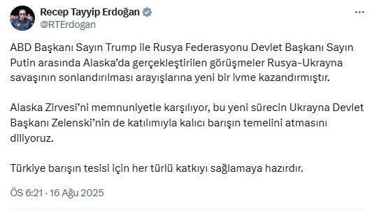 Cumhurbaşkanı Recep Tayyip Erdoğan, Alaska görüşmelerinin Rusya-Ukrayna savaşının sonlandırılması arayışlarına yeni bir ivme kazandırdığını belirterek, "Alaska Zirvesi'ni memnuniyetle karşılıyor, bu yeni sürecin Ukrayna Devlet Başkanı Zelenski'nin de katılımıyla kalıcı barışın temelini atmasını diliyoruz" dedi.