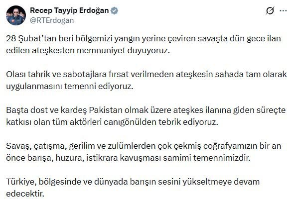 Erdoğan, "28 Şubat’tan beri bölgemizi yangın yerine çeviren savaşta dün gece ilan edilen ateşkesten memnuniyet duyuyoruz. Olası tahrik ve sabotajlara fırsat verilmeden ateşkesin sahada tam olarak uygulanmasını temenni ediyoruz. Başta dost ve kardeş Pakistan olmak üzere ateşkes ilanına giden süreçte katkısı olan tüm aktörleri canı gönülden tebrik ediyoruz. Savaş, çatışma, gerilim ve zulümlerden çok çekmiş coğrafyamızın bir an önce barışa, huzura, istikrara kavuşması samimi temennimizdir. Türkiye, bölgesinde ve dünyada barışın sesini yükseltmeye devam edecektir" ifadelerine yer verdi.