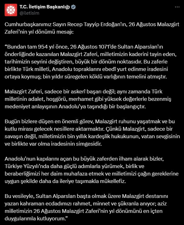 İletişim Başkanlığı, Cumhurbaşkanı Recep Tayyip Erdoğan'ın 26 Ağustos Malazgirt Zaferi'nin yıl dönümü mesajını yayımladı. Cumhurbaşkanı Erdoğan, mesajında, "Bundan tam 954 yıl önce, 26 Ağustos 1071'de Sultan Alparslan'ın önderliğinde kazanılan Malazgirt Zaferi, milletimizin kaderini tayin eden, tarihimizin seyrini değiştiren, büyük bir dönüm noktasıdır. Bu zaferle birlikte Türk milleti, Anadolu topraklarını ebedi yurt edinme iradesini ortaya koymuş; bin yıldır süregelen köklü varlığının temelini atmıştır. Malazgirt Zaferi, sadece bir askeri başarı değil; aynı zamanda Türk milletinin adalet, hoşgörü, merhamet gibi yüksek değerlerle bezenmiş medeniyet anlayışının Anadolu'ya taşındığı bir başlangıçtır. Bugün bizlere düşen en önemli görev, Malazgirt ruhunu yaşatmak ve bu kutlu mirası gelecek nesillere aktarmaktır. Çünkü Malazgirt, sadece bir savaşın değil, milletimizin bin yıllık kardeşlik hukukunun, vatan sevgisinin ve birlikte var olma iradesinin simgesidir" ifadelerine yer verdi.