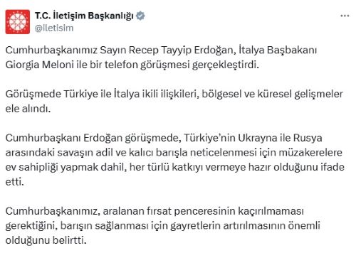 Cumhurbaşkanı Recep Tayyip Erdoğan, İtalya Başbakanı Giorgia Meloni ile telefonda görüştü.