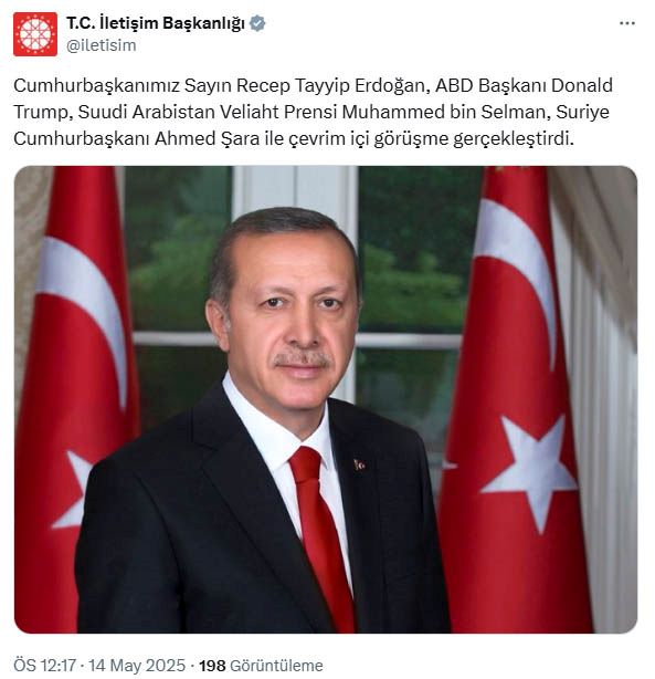 Cumhurbaşkanı Recep Tayyip Erdoğan, Recep Tayyip Erdoğan, ABD Başkanı Donald Trump, Suudi Arabistan Veliaht Prensi Muhammed bin Selman, Suriye Cumhurbaşkanı Ahmed Şara ile çevrim içi görüşme gerçekleştirdi.