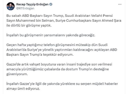 Cumhurbaşkanı Erdoğan, görüşmeye ilişkin sosyal medya hesabından açıklama yaptı. Erdoğan, "Bu sabah ABD Başkanı Sayın Trump, Suudi Arabistan Veliaht Prensi Sayın Muhammed bin Selman, Suriye Cumhurbaşkanı Sayın Ahmed Şara ile dörtlü bir görüşme yaptık. İnşallah bu görüşmenin yansımalarını yakında göreceğiz. Geçen hafta yaptığımız telefon görüşmesini müteakip dün Suudi Arabistan’da Suriye’ye yönelik yaptırımları kaldıracağını açıklayan ABD Başkanı Sayın Trump’a teşekkür ediyorum. Gazze’de artık vahşet boyutuna varan insani trajediye son verilmesi amacıyla yürüttüğümüz çabalarda da dostum Trump’ın desteğine güveniyorum. İnşallah Gazze’yle ilgili de yakında yüreklere su serpen müjdeli haberler almayı ümit ediyoruz" dedi.