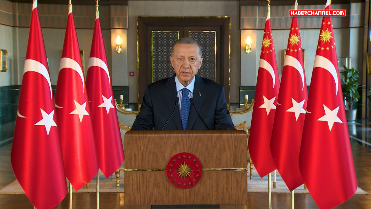 Erdoğan, Türkiye'nin hem güçlü hem de köklü bir devlet olduğunu vurgulayarak, "Cumhurbaşkanlığı forsumuzdaki güneş ve etrafındaki 16 yıldız, bizim binlerce yıllık devlet geleneğimizi temsil ediyor. 'Ebet-müddet' ülküsüyle kurduğumuz bu devletlerin her biri, milli kimliğimizin şan ve şeref payesi; cihana yön veren aziz milletimizin kudret ve merhamet nişanesidir. Türkiye Cumhuriyeti ise, tarihinin en sancılı günlerinde, onca zorluğa, yokluğa, sıkıntıya rağmen hürriyet ve istiklaline dört elle sarılan fedakar milletimizin son çatısı; devletler zincirimizin son halkasıdır. Bu yüksek şuurla şehit ve gazilerimizin emanetine sahip çıkmak; cesur ve cefakar ellerde yükselen Türkiye Cumhuriyeti’ni ilelebet payidar kılmak için var gücümüzle çalışıyoruz. Asra mührümüzü vuracağımız Türkiye Yüzyılı hedeflerimiz doğrultusunda; savunma sanayiinden ekonomiye, eğitimden tarıma, turizme, enerjiye ve dış politikaya kadar her alanda ezber bozan atılımlar içindeyiz. 6 Şubat 2023 tarihinde yaşadığımız deprem felaketinin yaralarını sarıyor, afetzede kardeşlerimizi hızla güvenli yuvalarına kavuşturuyoruz. İnşallah yıl sonuna kadar, söz verdiğimiz şekilde, 453 bin konutun anahtar teslimini gerçekleştirmiş olacağız" ifadelerine yer verdi.