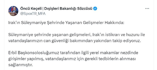 Dışişleri Bakanlığı Sözcüsü Öncü Keçeli, Irak’ın Süleymaniye şehrinde yaşanan çatışmalarla ilgili, "Erbil Başkonsolosluğumuz tarafından ilgili yerel makamlar nezdinde girişimler yapılmış, vatandaşlarımız için gerekli tedbirlerin alınması sağlanmıştır" dedi.