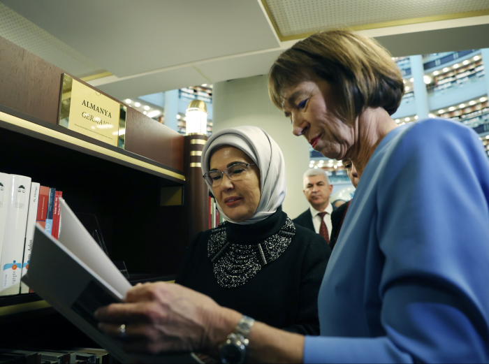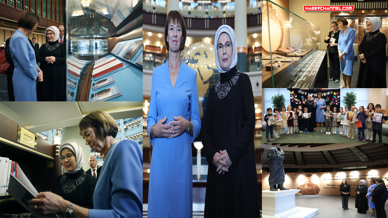 Emine Erdoğan, Charlotte Merz'i kütüphaneye gelişinde kapıda samimi şekilde karşıladı. Kütüphanenin Cihannüma Salonu'na geçen lider eşleri, Almanya Kitaplığı'ndaki eserleri inceledi. Emine Erdoğan, Merz'e Mevlana'nın 'Mesnevi' eserinin Almanca baskısını ve İletişim Başkanlığı'nca hazırlanan 'Türkiye' tanıtım kitabını hediye etti.