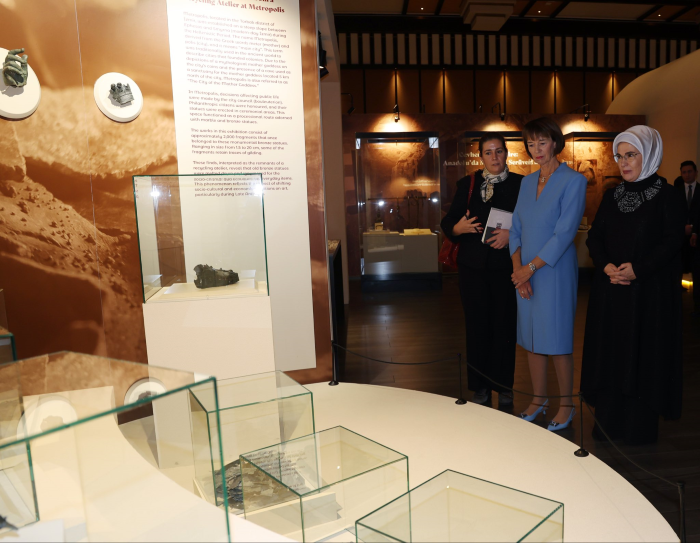 Lider eşleri daha sonra Cumhuriyet tarihinin en kapsamlı arkeoloji projesi 'Geleceğe Miras' kazılarıyla bulunan eserlerin yer aldığı 'Arkeolojinin Altın Çağı Sergisi'ni gezdi. Burdur'daki Boubon Antik Kenti'nde 1960'lı yıllarda yapılan kaçak kazılar sonucu yurt dışına çıkarılan ve 65 yıl aradan sonra Türkiye'ye getirilen, MS 2'nci ve 3'üncü yüzyıllara tarihlenen Roma İmparatoru Marcus Aurelius bronz heykelin de yer aldığı sergiyi ilgiyle gezen Emine Erdoğan ve Charlotte Merz, eserler hakkında bilgi aldı. Lider eşleri, kütüphane ziyaretinin ardından Devlet Konukevi'ne geçerek burada ikili görüşme gerçekleştirdi.
