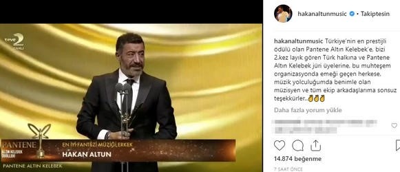 Türkiye’nin en prestijli ödülü olan Pantene Altın Kelebek’e, bizi 2.kez layık gören Türk halkına ve Pantene Altın Kelebek jüri üyelerine, bu muhteşem organizasyonda emeği geçen herkese, müzik yolculuğumda benimle olan müzisyen ve tüm ekip arkadaşlarıma sonsuz teşekkürler.