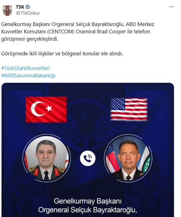 Genelkurmay Başkanı Orgeneral Selçuk Bayraktaroğlu, ABD Merkez Kuvvetler Komutanı (CENTCOM) Oramiral Brad Cooper ile telefonda görüştü.