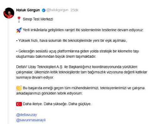 Görgün, "Yerli imkanlarla geliştirilen ramjet itki sistemlerinin testlerine devam ediyoruz: Yüksek hızlı, hava solumalı itki teknolojilerinde yeni bir eşik aşılması, geleceğin ses üstü uçuş platformlarına giden yolda stratejik bir kilometre taşı oluşturması bakımından büyük önem taşımaktadır. DeltaV Uzay Teknolojileri A.Ş. ile Başkanlığımız koordinasyonunda yürütülen çalışmalar; ülkemizin kritik teknolojilerde tam bağımsızlık vizyonuna değerli katkılar sunmaya devam ediyor. Bu başarıda emeği geçen tüm mühendislerimizi, teknisyenlerimizi ve çalışma arkadaşlarımızı gönülden tebrik ediyorum. Daha ileriye. Daha yükseğe. Daha güçlüye" dedi.