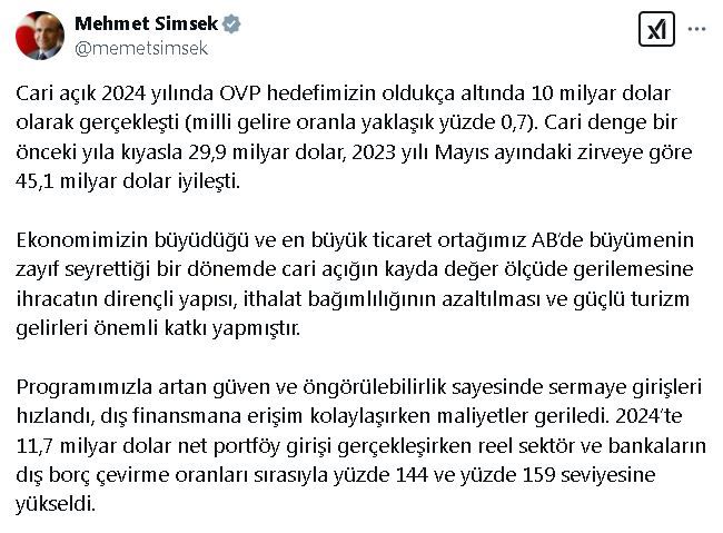 Hazine ve Maliye Bakanı Mehmet Şimşek, 2024 yılında cari açığın Orta Vadeli Program (OVP) hedeflerinin oldukça altında gerçekleştiğini açıkladı.