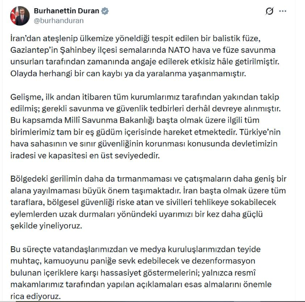 İletişim Başkanı Burhanettin Duran, Türk hava sahasına giren balistik füzenin imhasına ilişkin sanal medya hesabından açıklama yaptı. Duran, "İran'dan ateşlenip ülkemize yöneldiği tespit edilen bir balistik füze, Gaziantep'in Şahinbey ilçesi semalarında NATO hava ve füze savunma unsurları tarafından zamanında angaje edilerek etkisiz hale getirilmiştir. Olayda herhangi bir can kaybı ya da yaralanma yaşanmamıştır. Gelişme, ilk andan itibaren tüm kurumlarımız tarafından yakından takip edilmiş; gerekli savunma ve güvenlik tedbirleri derhal devreye alınmıştır. Bu kapsamda Milli Savunma Bakanlığı başta olmak üzere ilgili tüm birimlerimiz tam bir eş güdüm içerisinde hareket etmektedir. Türkiye’nin hava sahasının ve sınır güvenliğinin korunması konusunda devletimizin iradesi ve kapasitesi en üst seviyededir" dedi.