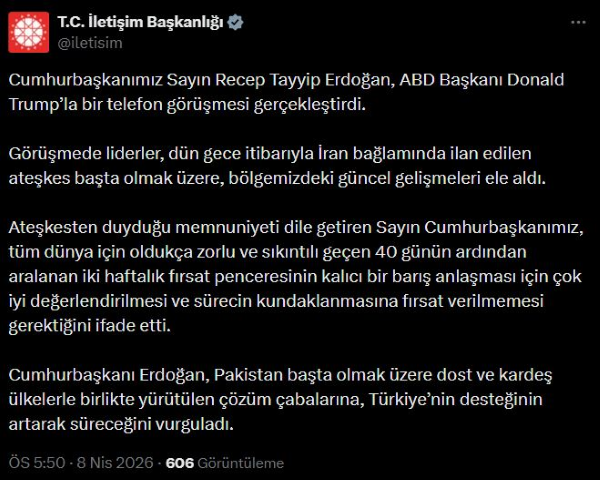 Görüşmede liderler, dün gece itibarıyla İran bağlamında ilan edilen ateşkes başta olmak üzere, bölgemizdeki güncel gelişmeleri ele aldı. Ateşkesten duyduğu memnuniyeti dile getiren Sayın Cumhurbaşkanımız, tüm dünya için oldukça zorlu ve sıkıntılı geçen 40 günün ardından aralanan 2 haftalık fırsat penceresinin kalıcı bir barış anlaşması için çok iyi değerlendirilmesi ve sürecin kundaklanmasına fırsat verilmemesi gerektiğini ifade etti. Cumhurbaşkanı Erdoğan, Pakistan başta olmak üzere dost ve kardeş ülkelerle birlikte yürütülen çözüm çabalarına, Türkiye’nin desteğinin artarak süreceğini vurguladı" ifadelerini kullandı.
