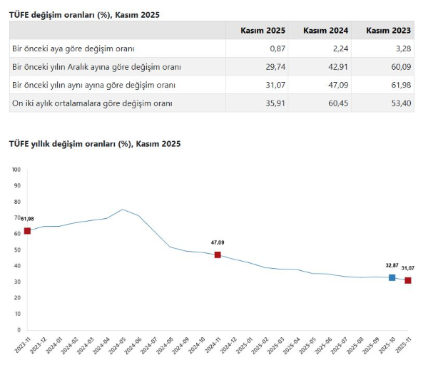 TÜİK, Kasım 2025 dönemine ilişkin enflasyon verilerini açıkladı. Buna göre; tüketici fiyatları 2025 yılı Kasım ayında bir önceki aya göre yüzde 0,87, bir önceki yılın aralık ayına göre yüzde 29,74, bir önceki yılın aynı ayına göre yüzde 31,07 ve 12 aylık ortalamalara göre yüzde 35,91 arttı.