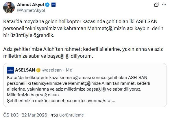 Milli Savunma Bakanı Yaşar Güler, şehitler için yayımladığı taziye mesajında, "Kahraman silah arkadaşımız ile ASELSAN'ın kahraman teknisyenleri, Katar Silahlı Kuvvetleri'ne ait bir helikopterin kaza kırıma uğraması sonucu 21 Mart 2026 tarihinde şehit olmuşlardır. Kahraman şehitlerimize şahsım ve Milli Savunma Bakanlığı mensupları adına Allah'tan rahmet; kederli ailelerine ve asil milletimize başsağlığı ve sabır dilerim" ifadelerini kullandı. (DHA)