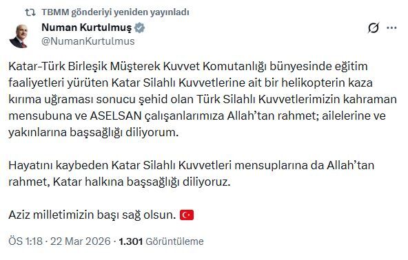 TBMM Başkanı Numan Kurtulmuş, sanal medya hesabından paylaştığı mesajda, "Katar-Türk Birleşik Müşterek Kuvvet Komutanlığı bünyesinde eğitim faaliyetleri yürüten Katar Silahlı Kuvvetlerine ait bir helikopterin kaza kırıma uğraması sonucu şehit olan Türk Silahlı Kuvvetlerimizin kahraman mensubuna ve ASELSAN çalışanlarımıza Allah’tan rahmet; ailelerine ve yakınlarına başsağlığı diliyorum. Hayatını kaybeden Katar Silahlı Kuvvetleri mensuplarına da Allah’tan rahmet, Katar halkına başsağlığı diliyoruz. Aziz milletimizin başı sağ olsun" dedi.