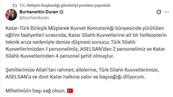 İletişim Başkanı Burhanettin Duran da sanal medya hesabından paylaştığı taziye mesajında, "Katar-Türk Birleşik Müşterek Kuvvet Komutanlığı bünyesinde yürütülen eğitim faaliyetleri sırasında, Katar Silahlı Kuvvetlerine ait bir helikopterin teknik arıza nedeniyle denize düşmesi sonucu; Türk Silahlı Kuvvetlerimizden 1 personelimiz, ASELSAN’dan 2 personelimiz ve Katar Silahlı Kuvvetlerinden 4 personel şehit olmuştur. Şehitlerimize Allah’tan rahmet; ailelerine, Türk Silahlı Kuvvetlerimize, ASELSAN’a ve dost Katar halkına sabır ve başsağlığı diliyorum. Milletimizin başı sağ olsun" ifadelerini kullandı. (DHA)