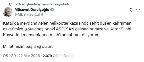 İYİ Parti Genel Başkanı Müsavat Dervişoğlu da sanal medya hesabından, "Katar’da meydana gelen helikopter kazasında şehit düşen kahraman askerimize, görev başındaki ASELSAN çalışanlarımıza ve Katar Silahlı Kuvvetleri mensuplarına Allah’tan rahmet diliyorum. Milletimizin başı sağ olsun" paylaşımında bulundu.