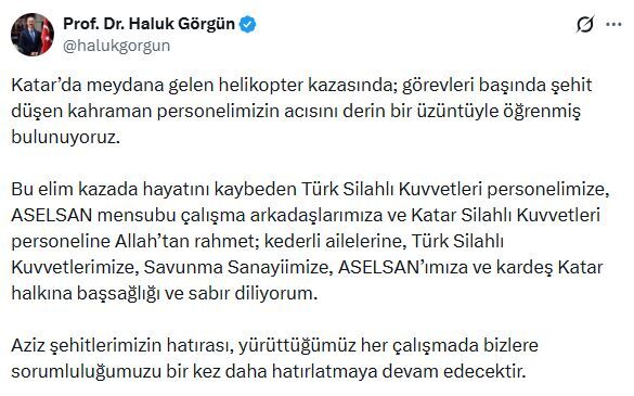 Savunma Sanayii Başkanı Haluk Görgün, sanal medya hesabından paylaştığı mesajda, "Katar'da meydana gelen helikopter kazasında; görevleri başında şehit düşen kahraman personelimizin acısını derin bir üzüntüyle öğrenmiş bulunuyoruz. Bu elim kazada hayatını kaybeden Türk Silahlı Kuvvetleri personelimize, ASELSAN mensubu çalışma arkadaşlarımıza ve Katar Silahlı Kuvvetleri personeline Allah’tan rahmet; kederli ailelerine, Türk Silahlı Kuvvetlerimize, Savunma Sanayiimize, ASELSAN’ımıza ve kardeş Katar halkına başsağlığı ve sabır diliyorum. Aziz şehitlerimizin hatırası, yürüttüğümüz her çalışmada bizlere sorumluluğumuzu bir kez daha hatırlatmaya devam edecektir" ifadelerini kullandı. (DHA)