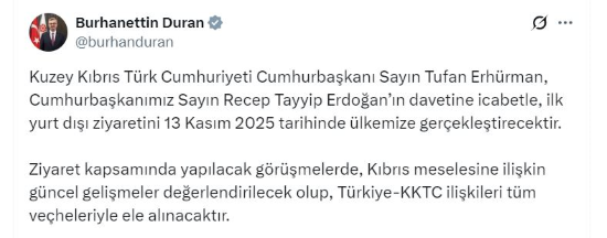 İletişim Başkanı Duran, sosyal medya hesabından yaptığı açıklamada, "Kuzey Kıbrıs Türk Cumhuriyeti Cumhurbaşkanı Sayın Tufan Erhürman, Cumhurbaşkanımız Sayın Recep Tayyip Erdoğan’ın davetine icabetle, ilk yurt dışı ziyaretini 13 Kasım 2025 tarihinde ülkemize gerçekleştirecektir. Ziyaret kapsamında yapılacak görüşmelerde, Kıbrıs meselesine ilişkin güncel gelişmeler değerlendirilecek olup, Türkiye-KKTC ilişkileri tüm veçheleriyle ele alınacaktır" dedi.