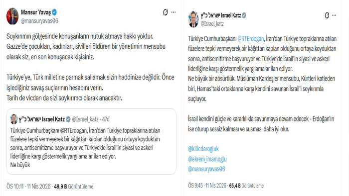 Ankara Büyükşehir Belediye Başkanı (ABB) Mansur Yavaş, sanal medya üzerinden yaptığı paylaşımla Cumhurbaşkanı Recep Tayyip Erdoğan’ı hedef alan İsrail Savunma Bakanı Israel Katz’a yanıt verdi.