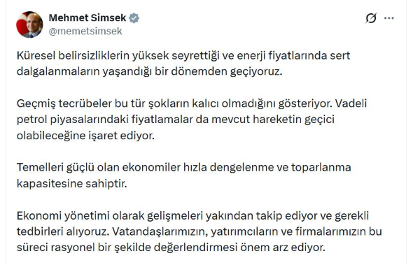 Bakan Şimşek, sanal medya hesabından yaptığı açıklamada, "Küresel belirsizliklerin yüksek seyrettiği ve enerji fiyatlarında sert dalgalanmaların yaşandığı bir dönemden geçiyoruz. Geçmiş tecrübeler bu tür şokların kalıcı olmadığını gösteriyor. Vadeli petrol piyasalarındaki fiyatlamalar da mevcut hareketin geçici olabileceğine işaret ediyor. Temelleri güçlü olan ekonomiler hızla dengelenme ve toparlanma kapasitesine sahiptir. Ekonomi yönetimi olarak gelişmeleri yakından takip ediyor ve gerekli tedbirleri alıyoruz. Vatandaşlarımızın, yatırımcıların ve firmalarımızın bu süreci rasyonel bir şekilde değerlendirmesi önem arz ediyor" dedi.