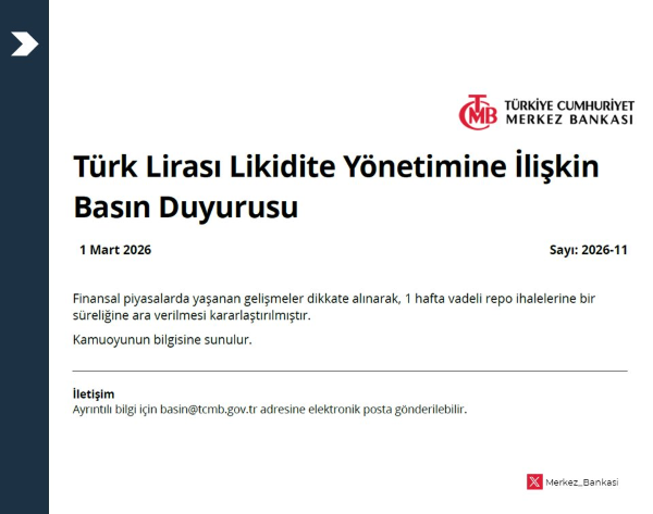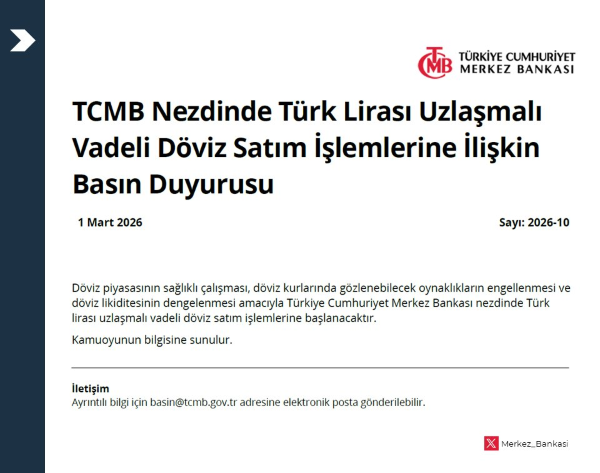 Türkiye Cumhuriyet Merkez Bankası (TCMB), döviz kurlarında gözlenebilecek oynaklıkların engellenmesi amacıyla Türk lirası uzlaşmalı vadeli döviz satım işlemlerine başlanacağını açıkladı. Ayrıca, 1 hafta vadeli repo ihalelerine bir süreliğine ara verileceğini duyurdu.