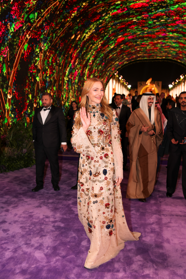 Sıcak bej tonlarındaki uzun kollu tasarım; heykelsi yüksek yakası, yapılandırılmış silueti ve yere kadar uzanan etkileyici formuyla zamansız bir zarafet sunuyor. Gövde ve etek boyunca iki zanaatkâr tarafından 35 günde elde işlenen floral kristal nakışlar, kırmızı, safir mavisi ve antik altın tonlarında mücevher etkisi yaratan sofistike bir ışıltı kazandırıyor.
