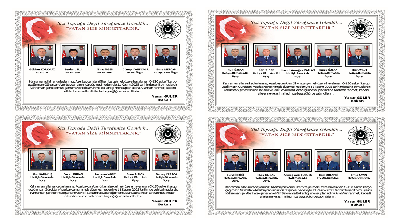 Milli Savunma Bakanlığı sosyal medya hesabından yapılan paylaşımda, Azerbaycan’dan Türkiye’ye dönmek üzere havalanan C-130 askeri kargo uçağının Gürcistan-Azerbaycan sınırında düşmesi sonucu 20 askerin şehit olduğunu açıkladı. Şehit olan askerlerin isimleri şöyle: