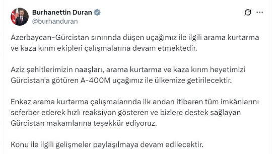 İletişim Başkanı Burhanettin Duran, sosyal medya hesabından yaptığı açıklamada, "Azerbaycan-Gürcistan sınırında düşen uçağımız ile ilgili arama kurtarma ve kaza kırım ekipleri çalışmalarına devam etmektedir. Aziz şehitlerimizin naaşları, arama kurtarma ve kaza kırım heyetimizi Gürcistan'a götüren A-400M uçağımız ile ülkemize getirilecektir. Enkaz arama kurtarma çalışmalarında ilk andan itibaren tüm imkanlarını seferber ederek hızlı reaksiyon gösteren ve bizlere destek sağlayan Gürcistan makamlarına teşekkür ediyoruz. Konu ile ilgili gelişmeler paylaşılmaya devam edilecektir" dedi. (DHA)