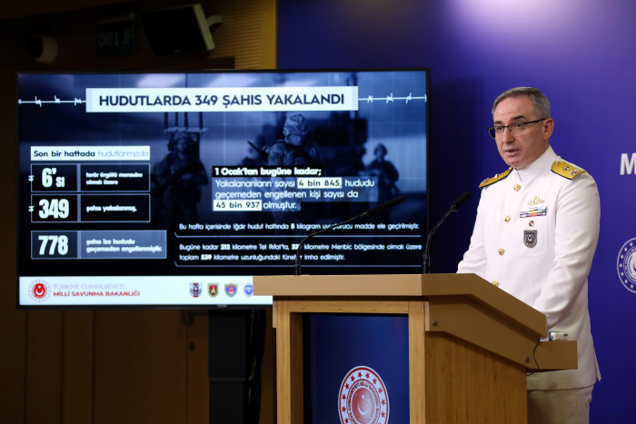 MSB Basın ve Halkla İlişkiler Müşaviri Tuğamiral Zeki Aktürk, bakanlıkta haftalık faaliyetlere ilişkin bilgilendirme toplantısı düzenledi. Aktürk, 2'nci Kıbrıs Barış Harekatı'nın yıl dönümünü kutlayarak şehitleri andı. Son bir haftadaki terörle mücadele çalışmalarına değinen Aktürk, "Bekamıza yönelen tüm tehdit ve tehlikelere karşı mücadelesini kararlılıkla sürdüren Türk Silahlı Kuvvetlerimizin devam eden operasyon ve arama tarama faaliyetleri kapsamında son bir haftada; barınma alanlarından kaçan 1 PKK'lı terörist daha teslim olmuş, Pençe-Kilit başta olmak üzere operasyon bölgelerinde tespit edilen, teröristlere ait mağara, sığınak ve barınaklarda ele geçirilen çok sayıda silah, mühimmat ve muhtelif malzeme kullanılamaz hale getirilmiştir. 7 gün 24 saat esasıyla en üst seviyede güvenliğin tesis edildiği hudutlarımızda son bir haftada yasa dışı yollarla geçmeye çalışan 6'sı terör örgütü mensubu olmak üzere 349 şahıs yakalanmış, 778 şahıs ise hududu geçemeden engellenmiştir. Böylelikle 1 Ocak'tan bugüne kadar hudutlarımızdan yasa dışı yollarla geçmeye çalışırken yakalananların sayısı 4 bin 845, hududu geçemeden engellenen kişi sayısı da 45 bin 937 olmuştur. Yine bu hafta içerisinde Iğdır hudut hattında 5 kilogram uyuşturucu madde ele geçirilmiştir. Suriye harekat alanlarında gerçekleştirilen tünel imha faaliyetleri kapsamında; bugüne kadar 212 kilometre Tel Rıfat'ta, 327 kilometre Menbic bölgesinde olmak üzere toplam 539 kilometre uzunluğundaki tüneller imha edilmiştir" dedi.