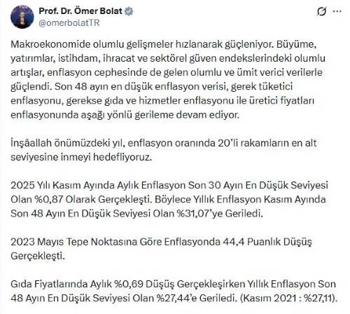 Ticaret Bakanı Ömer Bolat, kasım ayı enflasyon verilerine ilişkin sosyal medya hesabından açıklama yaptı. Bakan Bolat, "Makroekonomide olumlu gelişmeler hızlanarak güçleniyor. Büyüme, yatırımlar, istihdam, ihracat ve sektörel güven endekslerindeki olumlu artışlar, enflasyon cephesinde de gelen olumlu ve ümit verici verilerle güçlendi. Son 48 ayın en düşük enflasyon verisi gerek tüketici enflasyonu gerekse gıda ve hizmetler enflasyonu ile üretici fiyatları enflasyonunda aşağı yönlü gerileme devam ediyor. İnşallah önümüzdeki yıl, enflasyon oranında 20'li rakamların en alt seviyesine inmeyi hedefliyoruz" ifadelerine yer verdi.