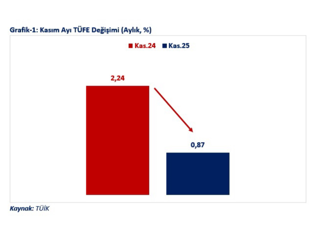 Kasım ayında aylık enflasyonun son 30 ayın en düşük seviyesi olan yüzde 0,87, yıllık enflasyonun son 48 ayın en düşük seviyesi olan yüzde 31,07'ye gerilediğini aktaran Bolat, "2023 Mayıs tepe noktasına göre enflasyonda 44,4 puanlık düşüş gerçekleşti. Gıda fiyatlarında aylık yüzde 0,69 düşüş gerçekleşirken yıllık enflasyon son 48 ayın en düşük seviyesi olan yüzde 27,44'e geriledi. Hizmetler grubunda yıllık enflasyon kasım ayında bir önceki aya göre 0,23 puan azalarak son 43 ayın en düşük seviyesi olan yüzde 44,21 olarak gerçekleşmiştir. Kira fiyatlarında kasım ayında aylık enflasyon son 33 ayın en düşük seviyesi olan yüzde 2,49 oranında gerçekleşirken, yıllık enflasyon son 32 ayın en düşük seviyesi olan yüzde 63,59 olarak gerçekleşmiştir. Enerji, gıda ve içecekler, tütün ve altın ürünleri hariç TÜFE aylık enflasyonu, kasım ayında yüzde 1,22 oranında gerçekleşirken yıllık çekirdek enflasyon ise kasım ayında son 48 ayın en düşük seviyesi olan yüzde 31,65'e inmiştir" açıklamasında bulundu.