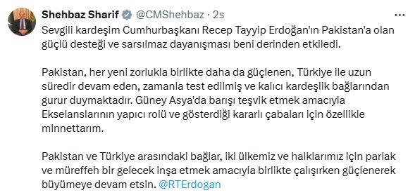 Pakistan Başbakanı Şahbaz Şerif, "Pakistan, her yeni zorlukla birlikte daha da güçlenen, Türkiye ile uzun süredir devam eden, zamanla test edilmiş ve kalıcı kardeşlik bağlarından gurur duymaktadır. Güney Asya'da barışı teşvik etmek amacıyla Ekselanslarının yapıcı rolü ve gösterdiği kararlı çabaları için özellikle minnettarım" dedi.